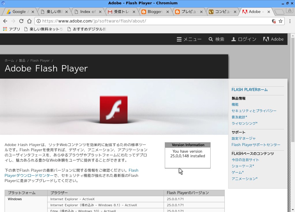 実際にFlash Playerのバージョンを https://www.adobe.com/jp/software/flash/about/ で確かめてみました。